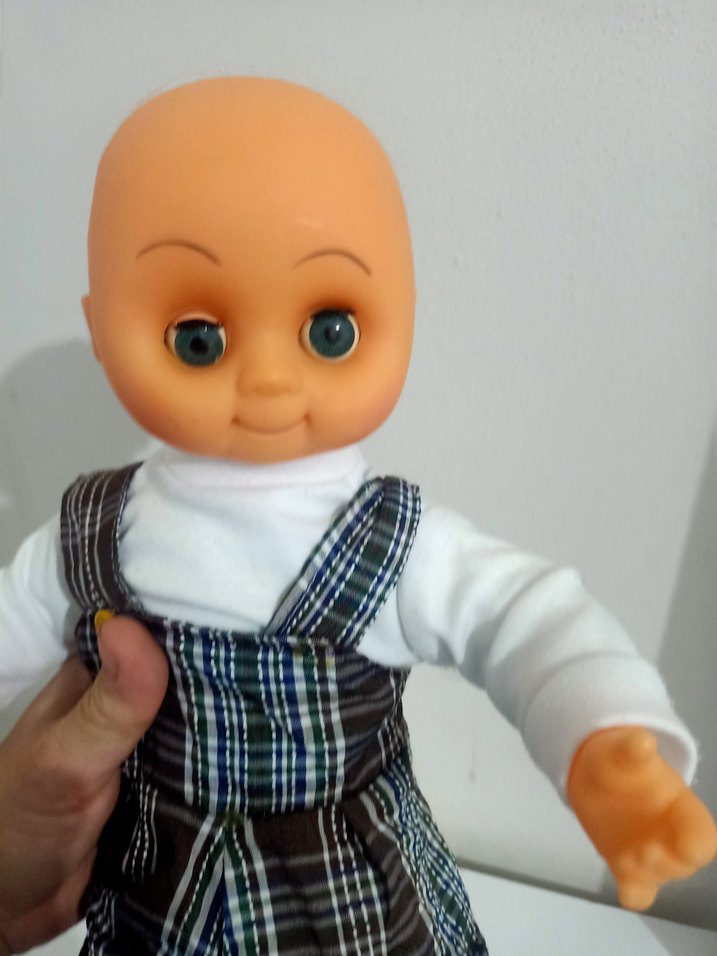 Bej renkte, koyu gözlü ve beyaz uzun kollu tişört ile ekose elbise giymiş oyuncak bebek. Düz, kel kafa ve yumuşak plastik malzemeden yapılmıştır.