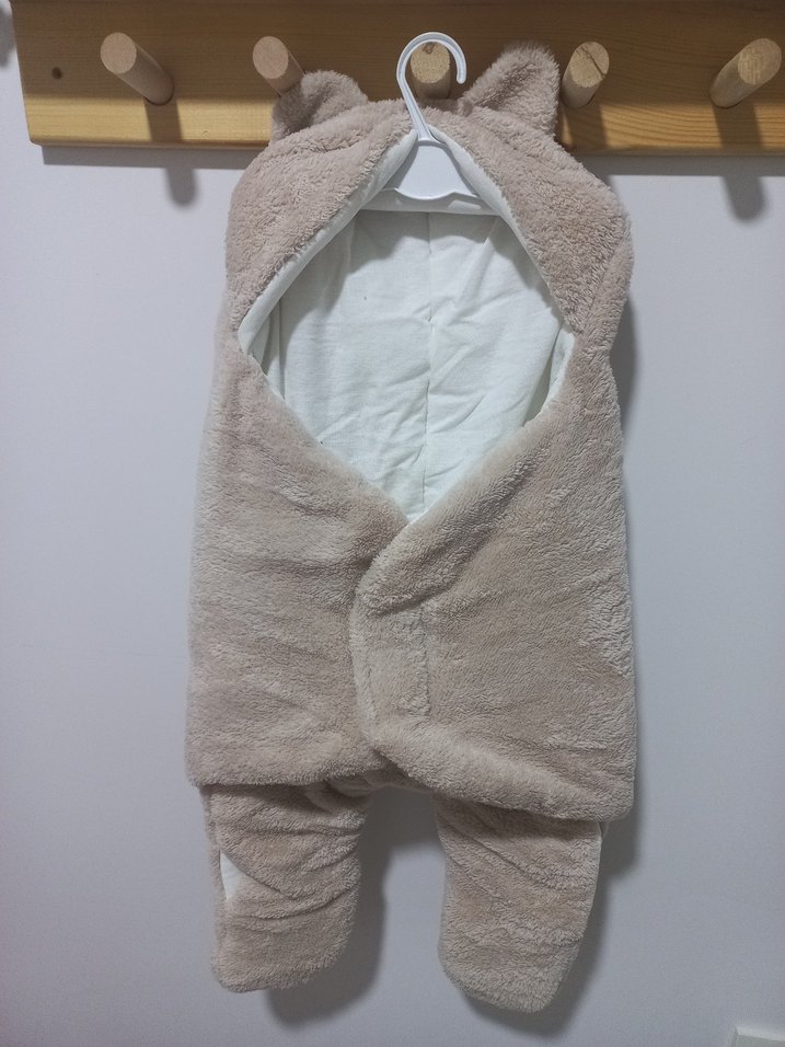 Yumuşak ve sıcak bej renkli bebek battaniyesi, kapüşonlu ve ayıcık kulaklı, konforlu kumaştan yapılmıştır.