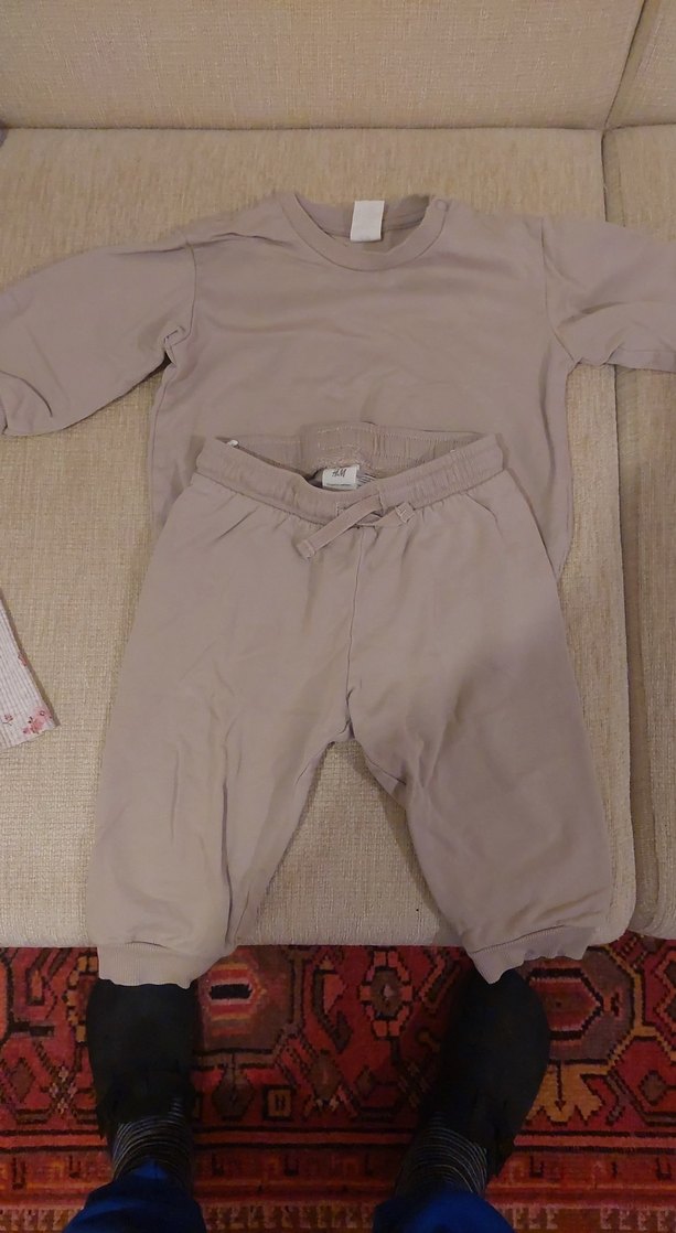 Bej renkte, yuvarlak yakalı uzun kollu üst ve rahat pantolondan oluşan bebek takımı. Yumuşak ve sıcak kumaştan, desen içermeyen sade tasarım.
