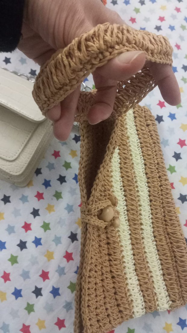 Yumuşak dokulu, çizgili desende bej bebek taşıma askısı, güvenli düğme kapamalı. Bebek taşıma için rahat.