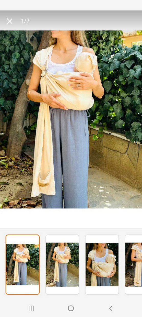 Yumuşak kumaştan yapılmış açık bej bebek taşıma slingi, bebeğinizi rahat ve güvenli taşımak için ayarlanabilir halkalı kapanışa sahiptir.
