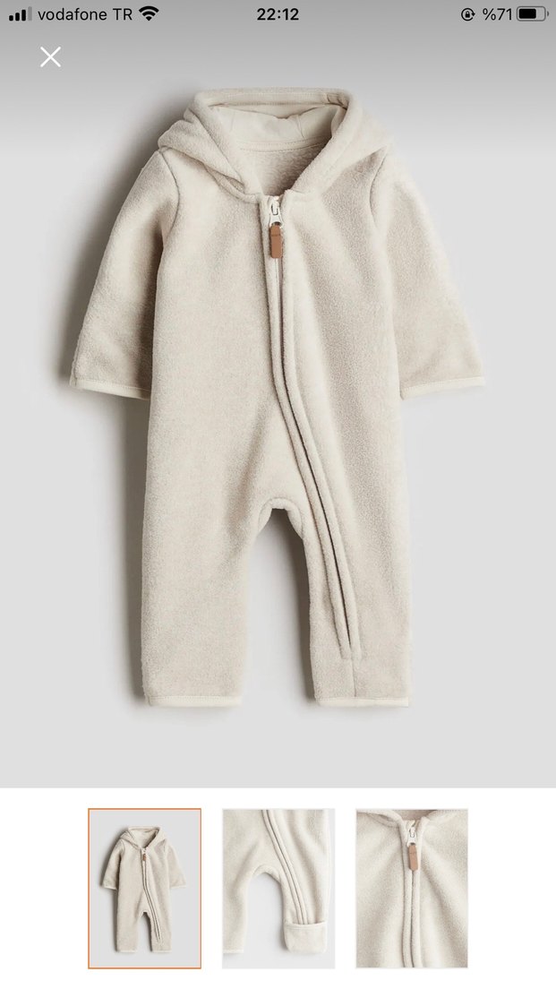 Bej renkli, kapüşonlu ve ön fermuarlı bebek tulumu, yumuşak ve sıcak kumaştan yapılmıştır. Desensiz ve normcore tarzındadır. Ürün sıfır ayarındadır rahatlıkla alabilirsiniz