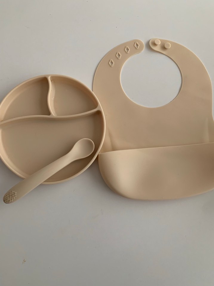 Bej renkli, bölmeli tabak, kaşık ve ayarlanabilir düğmeli silikon önlükten oluşan çocuk yemek seti. Yumuşak, güvenli malzemeden ve kolay temizlenir. Melenibaby markası