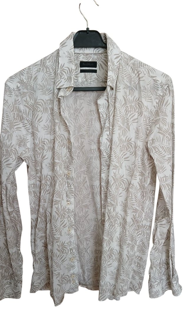 Bej ve gri tonlarında, uzun kollu, yakalı ve düğmeli erkek keten gömlek. Rahat kesim ve yaprak desenli, günlük sokak stiline uygun.
