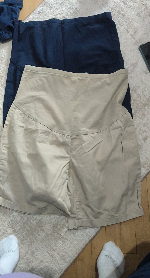 Bej renkte, bel detaylı ve bol kesim hamile şortu. Yumuşak sentetik kumaştan, midi boy ve desensiz, günlük dış mekan kullanımı için uygundur.