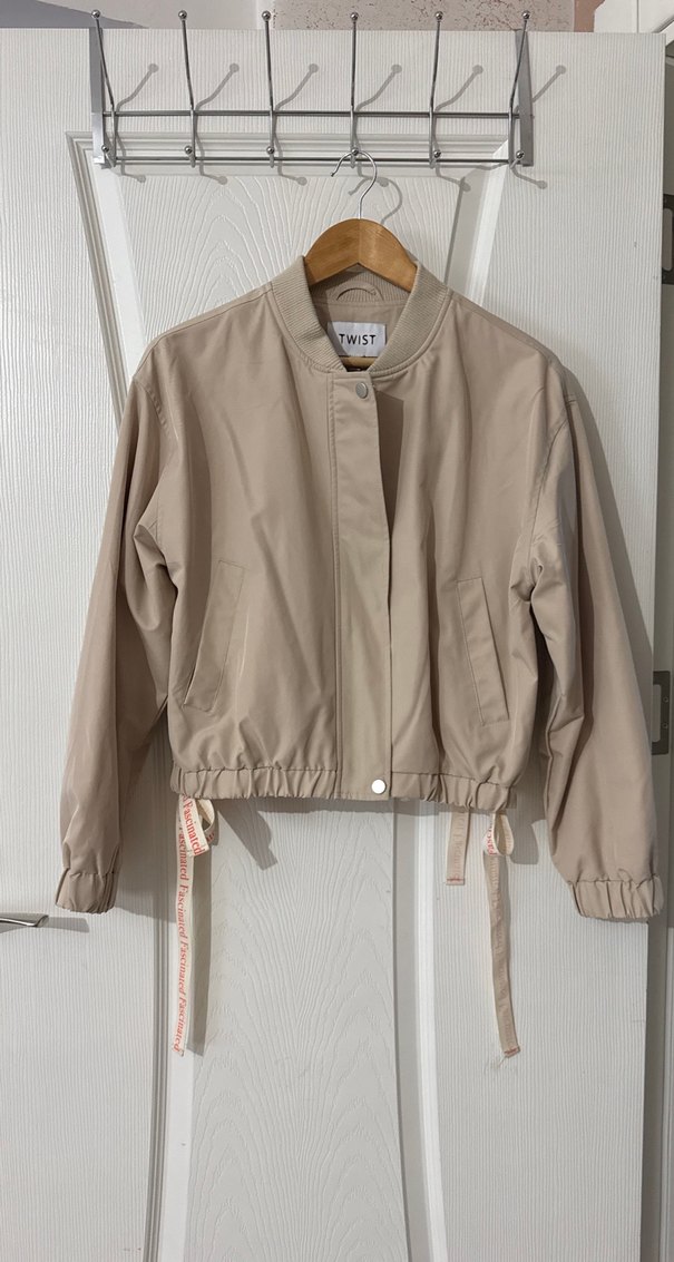 Bej renkte, uzun kollu, belden bağlamalı ve bol kesimli kadın ceket. Sentetik kumaştan, çıtçıt detaylı ve midi boyda, günlük kullanıma uygun.