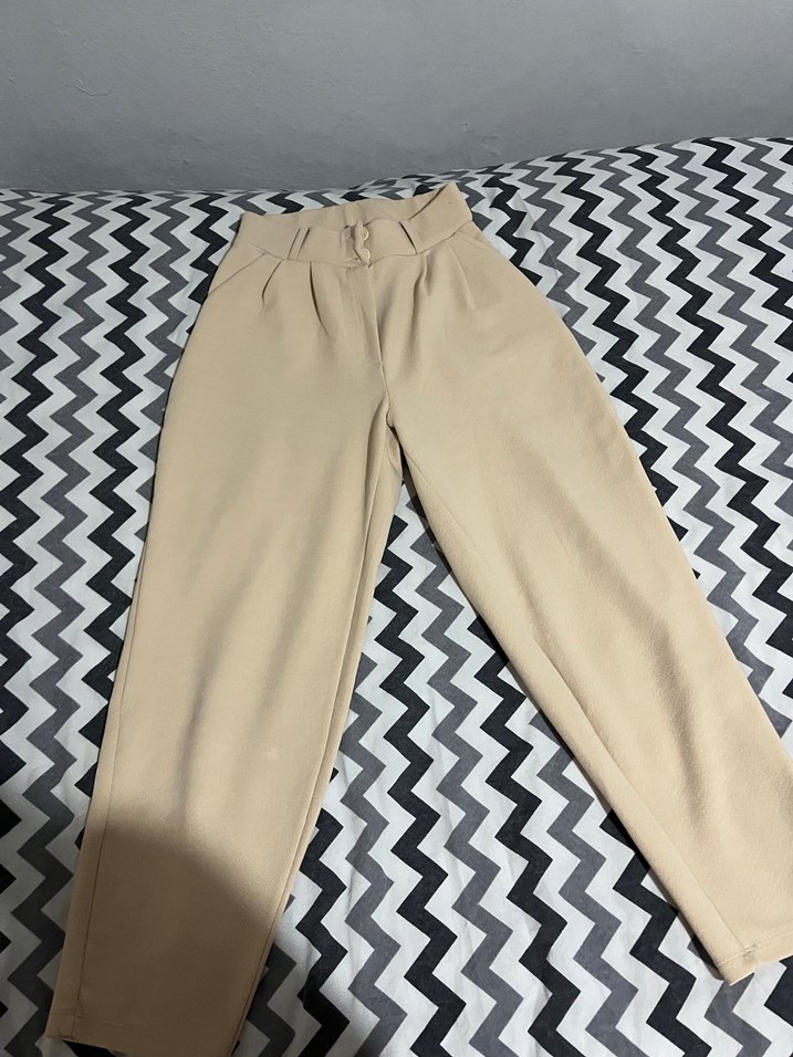 Bej renkli, beli kemerli, regular fit ve midi boy kadın kumaş pantolon. Yumuşak sentetik kumaştan, gündelik rahat sokak stili için uygun.