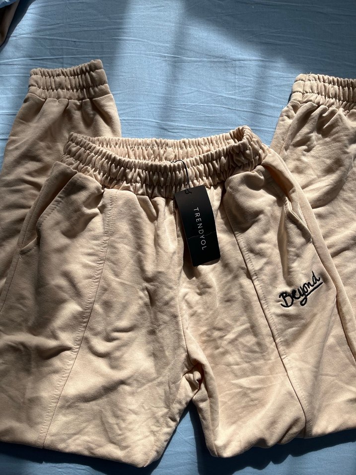 Yumuşak keten kumaştan, bel kemerli, bol kesim bej kadın eşofman. Midi boy ve desensiz, rahat sokak stili için uygun.