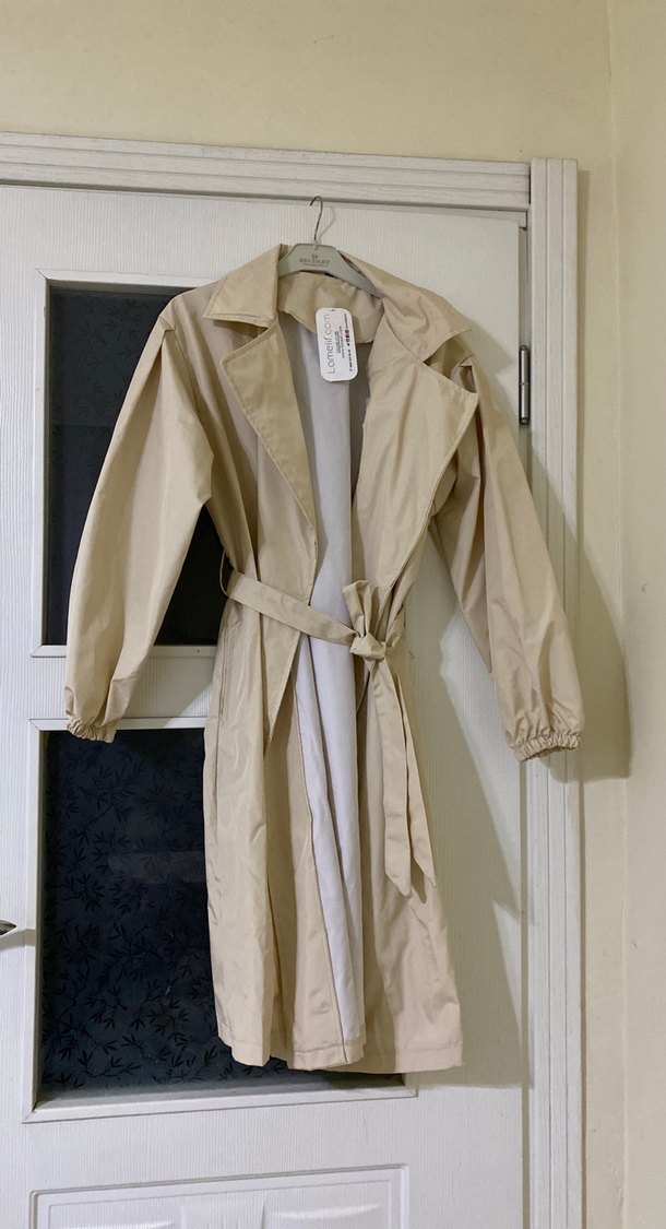 Bej renkli, beli kuşaklı ve notched yaka detaylı uzun trençkot. Sentetik kumaştan, bol kesim ve askılı kollu tasarım, günlük kullanıma uygun.