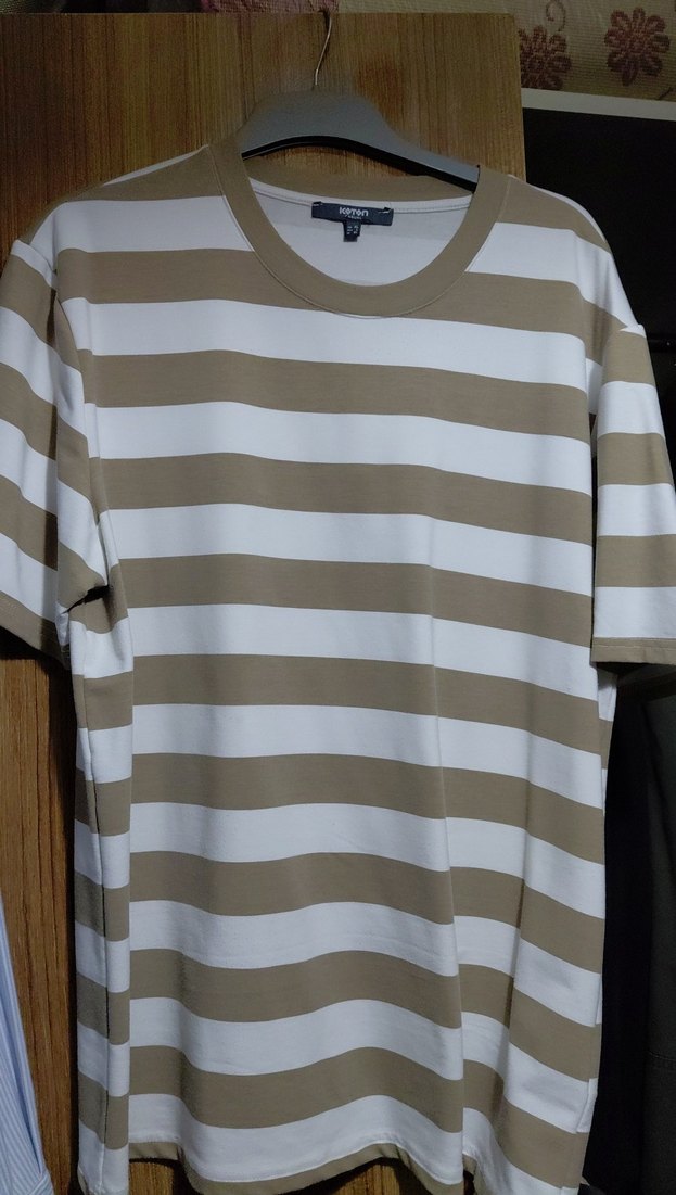 Bej ve beyaz çizgili, kısa kollu ve yuvarlak yaka erkek tişörtü. Rahat kesimi ve günlük sokak stili ile günlük kullanıma uygundur.