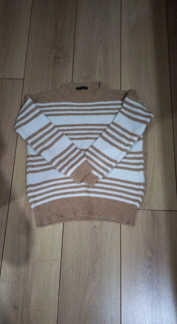 Uzun kollu, yuvarlak yaka, bej ve beyaz çizgili örgü triko kazak. Rahat kesimi ve midi boyuyla günlük sokak stiline uygundur.