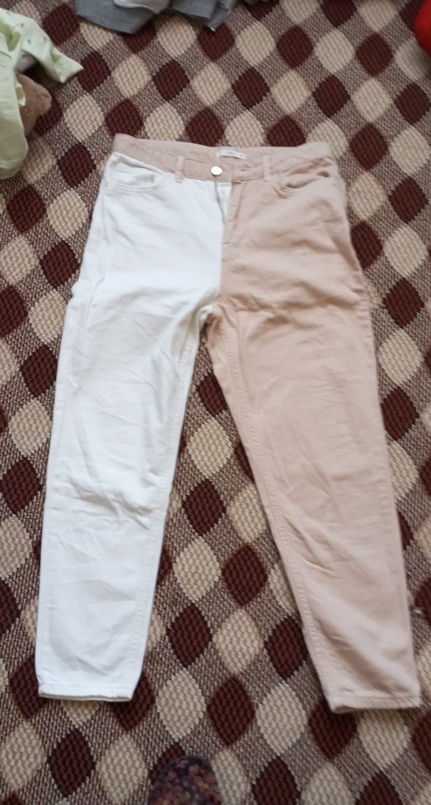Bej ve beyaz renkte, pamuklu, bol kesim midi boy kadın kot pantolon. Günlük kullanıma uygun rahat ve şık sokak stili.