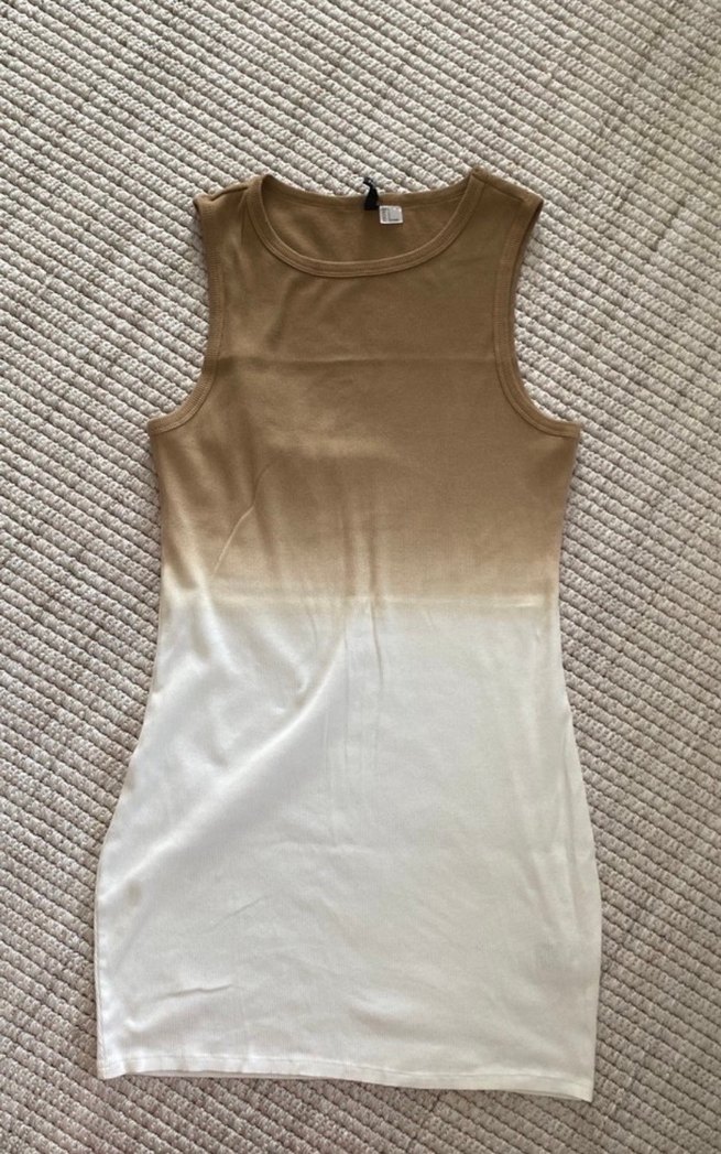 Bej ve beyaz tonlarında, kolsuz ve vücuda oturan midi elbise. Yumuşak sentetik kumaştan, günlük sokak stiline uygun.