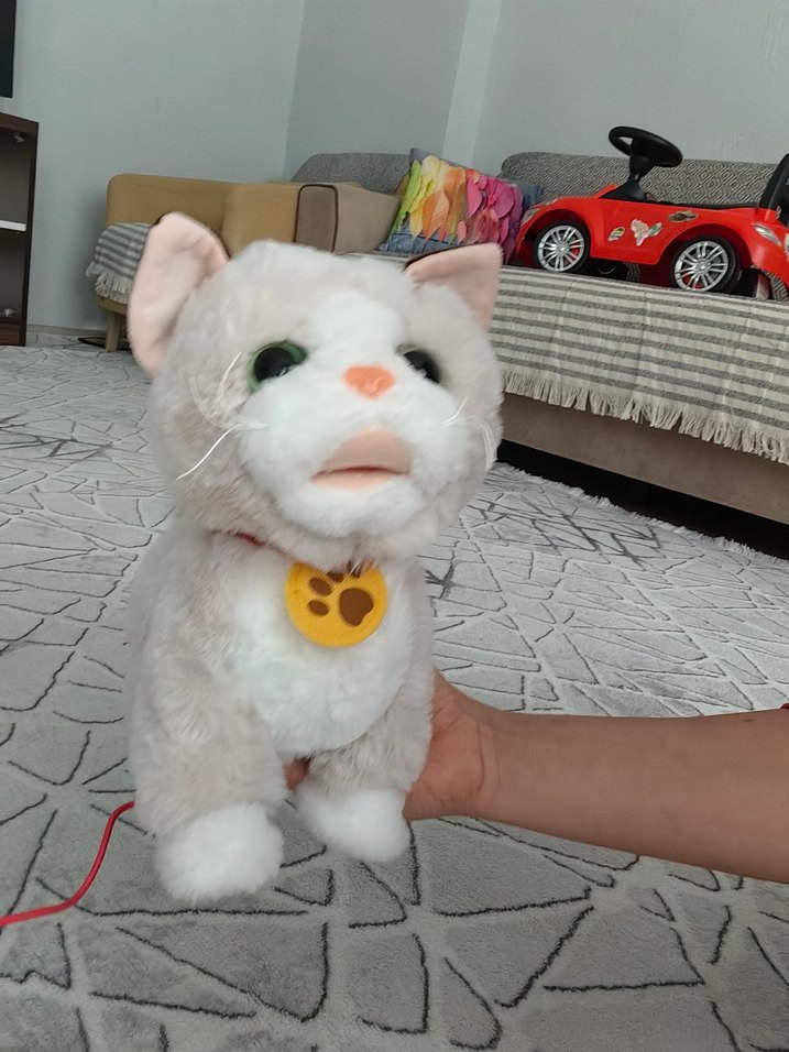 Pembe tasmalı, bej renklerde yumuşak ve yürüyebilen oyuncak kedi. Tüylü müzikli konuşan ve miyav sesi çıkaran kedicik
