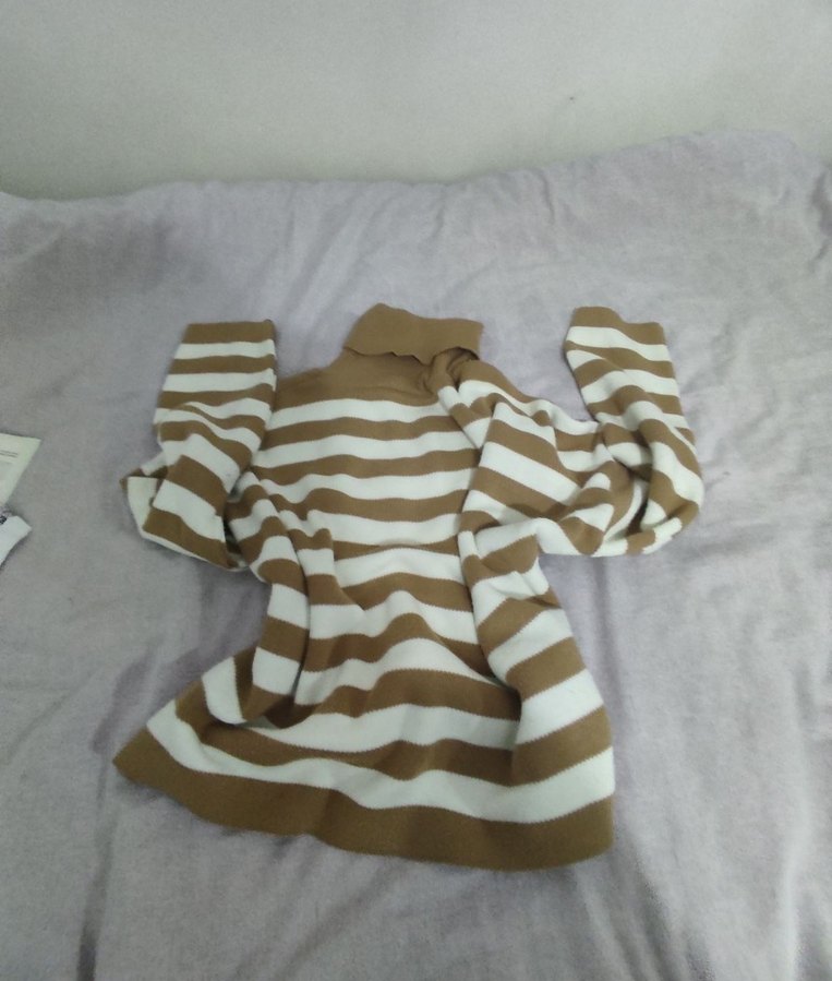 Boğazlı ve uzun kollu, rahat kesim kadın kazak. Bej ve beyaz zebra desenli, orta boy uzunlukta ve yumuşak, sıcak kumaştan örülmüştür. Rahat sokak stili için uygundur. üründe tiftifliklenme vardir
