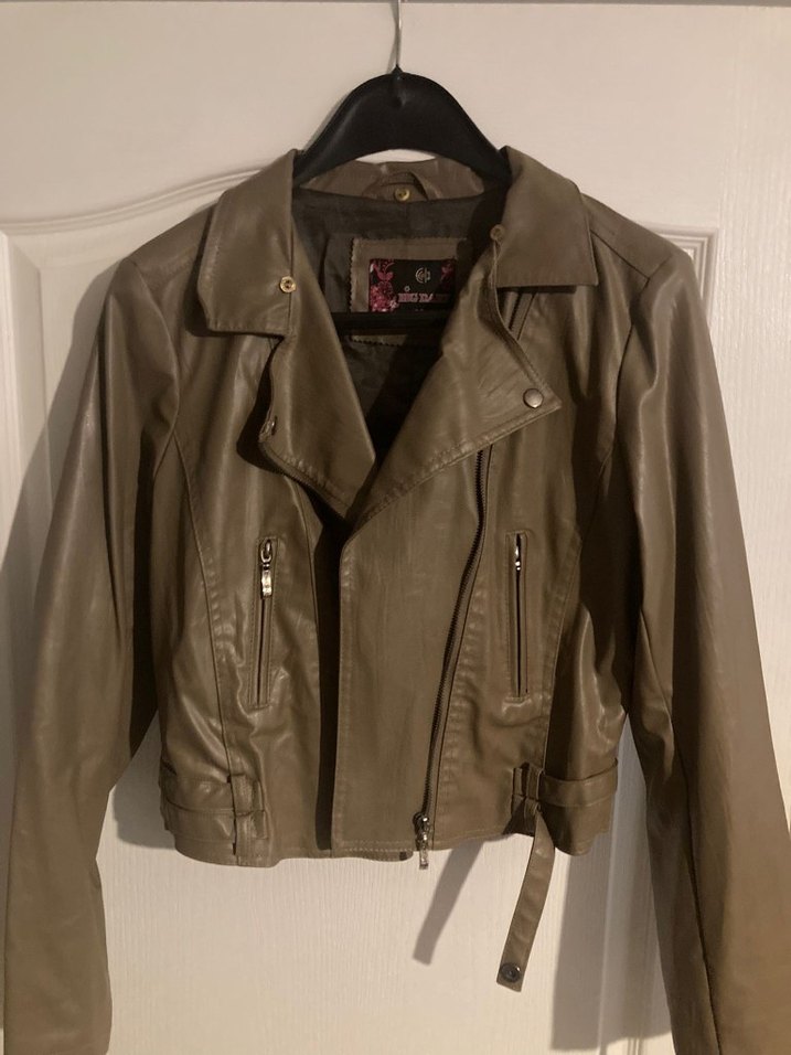 Bej renkli, kemerli ve kesimi vücuda oturan biker deri ceket. Notlu yaka ve askılı kol detayına sahiptir, midi boyda günlük kullanıma uygundur.