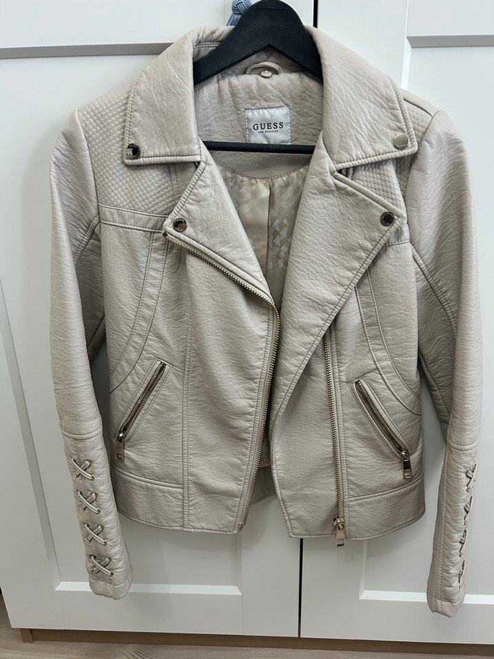 Bej renkte, düğmeli detaylara ve kesimli yakaya sahip GUESS deri ceket. Strappy kollu, normal midi boyda ve vücuda oturan kesimle trendy casual tarzı yansıtıyor. Sadece bir defa gıyıldi dar geldiği için satışa çıkardım Paris’ten alınmıştır