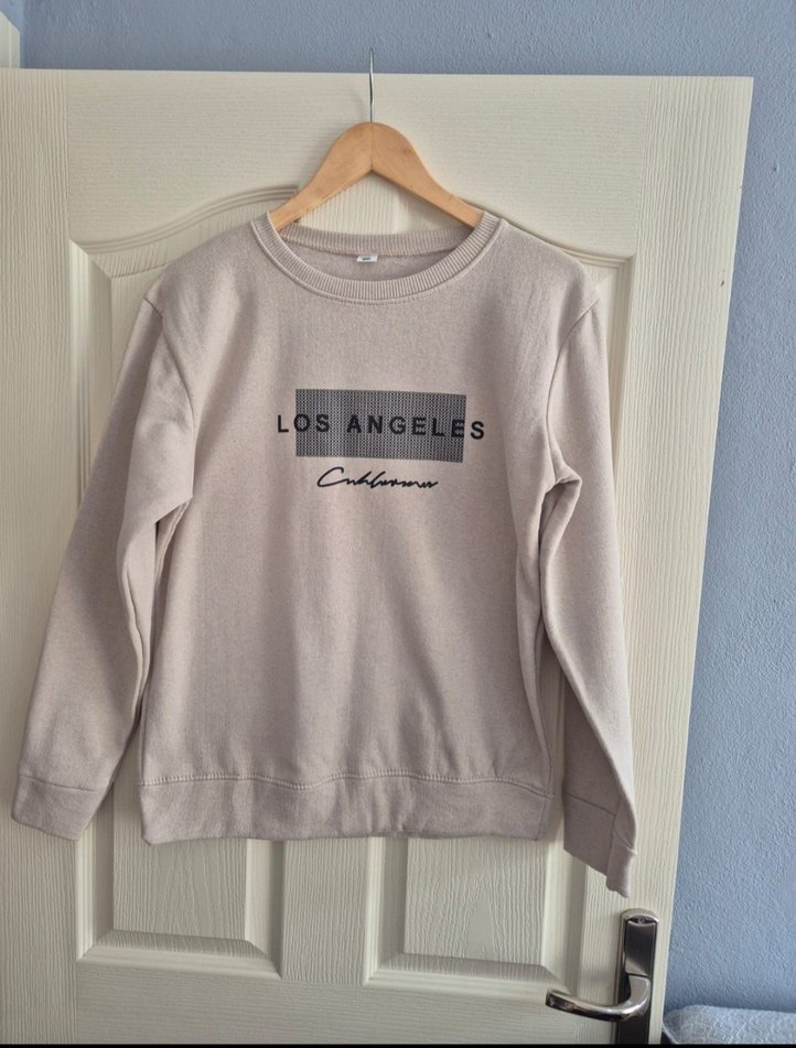 Bej renkte, pamuklu uzun kollu ve bol kesim kadın sweatshirt. Önünde gri 'LOS ANGELES' baskısı bulunur. Rahat ve günlük kullanım için uygundur.