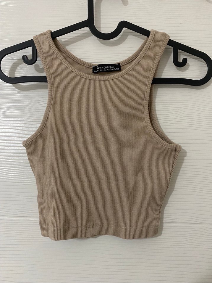 Bej renkte, Bisiklet yakalı ve kolsuz kısa bir kadın atleti. Nefes alabilen keten kumaştan üretilmiş, minimal ve şık tasarım, günlük sokak stiline uygun.