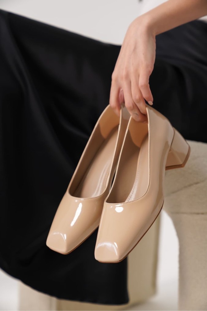 Bej renkte, blok topuklu ve kauçuk malzemeden yapılmış kadın klasik ayakkabısı. Ofis için modern ve Paris tarzı, zahmetsiz şıklık sunar.