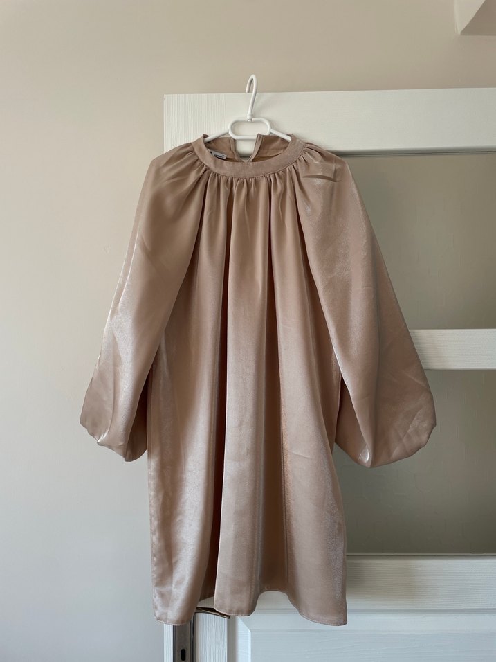 Bej uzun kollu ve salaş kesimlidir. Drapeli tasarımı ve yuvarlak yakasıyla rahat ve şık bir günlük modeldir. Saten şık 1 kez kullanıldı