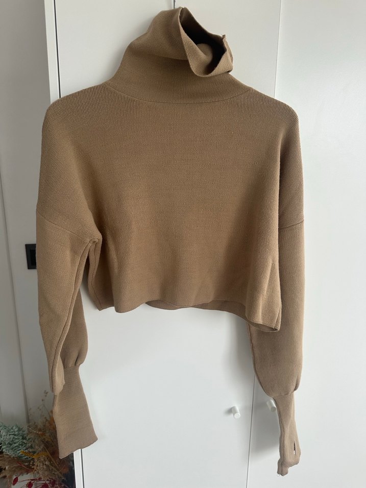 Bej renkli, boğazlı ve uzun kollu, triko kumaştan yapılmış, rahat ve sokak stiline uygun, normal midi uzunlukta kadın kazak.