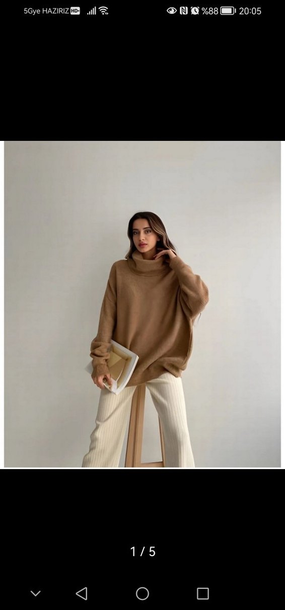 Bej kadın triko kazak, bol kesim ve midi boyda. Yumuşak yünden üretilmiş, boğazlı ve uzun kollu. Günlük kullanım için rahat ve şık bir tercih.export ürün dür onun için etiketi kesik