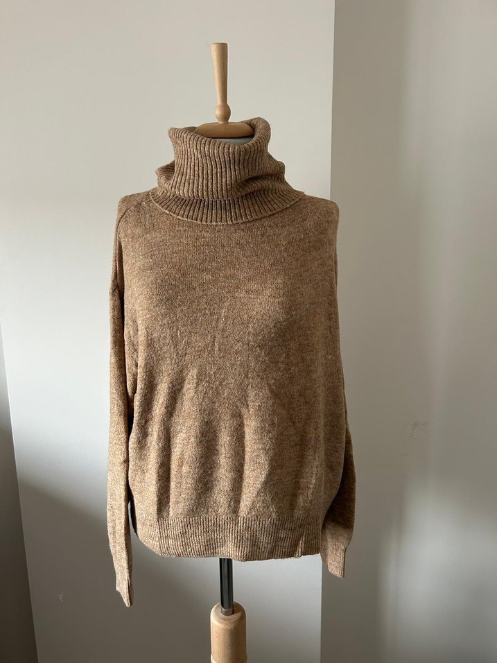 Bej renkte, boğazlı ve uzun kollu kadın triko kazak. Yumuşak yünden örülmüş, rahat ve bol kesim. Günlük kullanıma uygun, midi boyda.