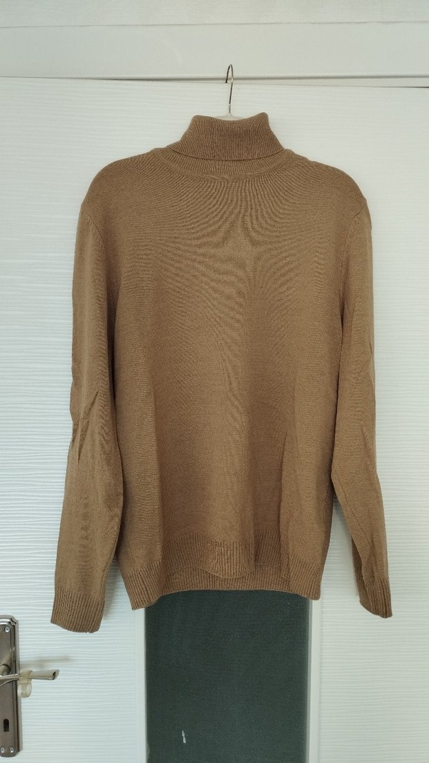Bej renkli, boğazlı ve uzun kollu kazak. Rahat ve bol kesimiyle günlük kullanıma uygun midi boyda, sade tasarımlı bir parça.
