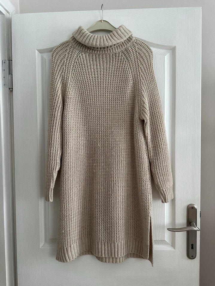 Bej renkli, örgü dokulu kadın kazak. Boğazlı, uzun kollu. standart beden