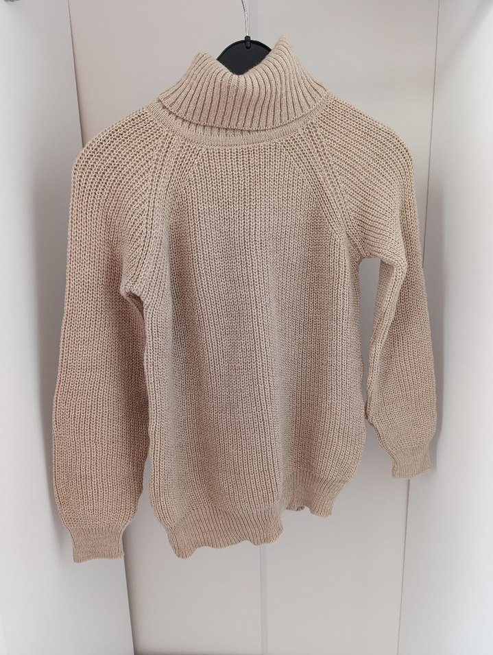 Bej renkli, boğazlı ve örgü detaylı kadın kazak.