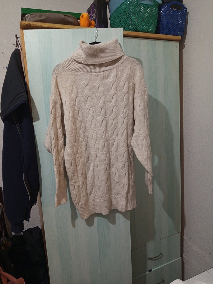 Bej renkli, boğazlı ve uzun kollu örgü kadın kazak. Rahat kesimi ve midi boyu ile günlük sokak stiline uygun, yumuşak örgü kumaştan yapılmıştır.