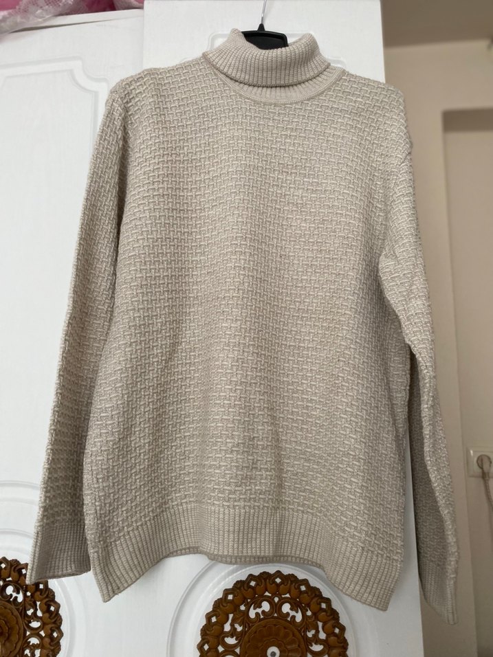 Bej renkli, boğazlı ve uzun kollu örgü kazak, rahat ve normal boyda, desen içermeyen sade tasarıma sahiptir. Günlük kullanıma uygundur.