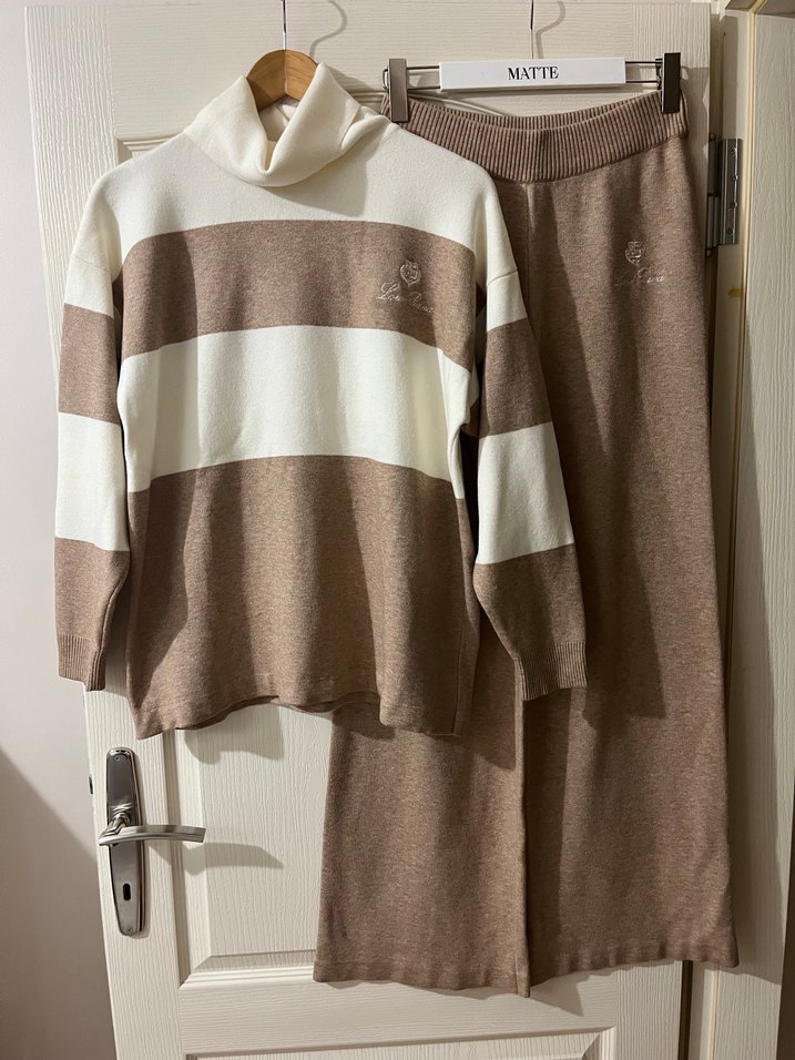 Bej Boğazlı Triko Kadın Kazak pantolon takım