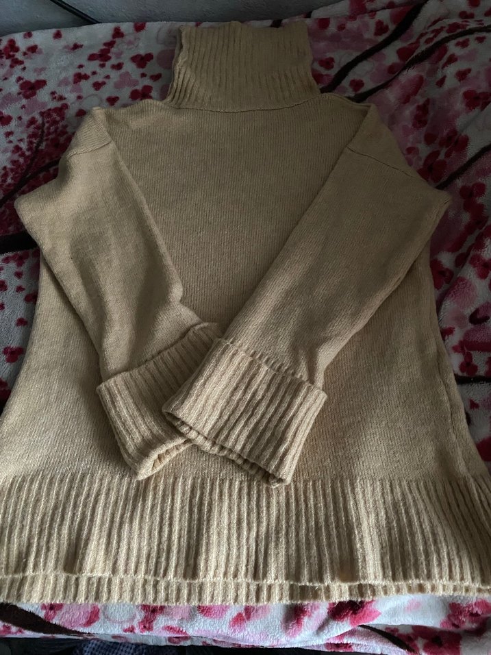 Bej renkte, boğazlı ve uzun kollu örme kazak. Salaş kesimi ve normal boyu ile rahat bir kullanım sunar.