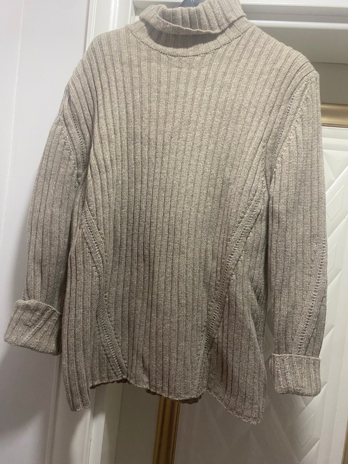 Bej renkte, boğazlı ve uzun kollu örme triko kazak. Rahat kesimi ve normal boyu ile gündelik kullanıma uygundur. Örgü kumaşı sıcak tutar.