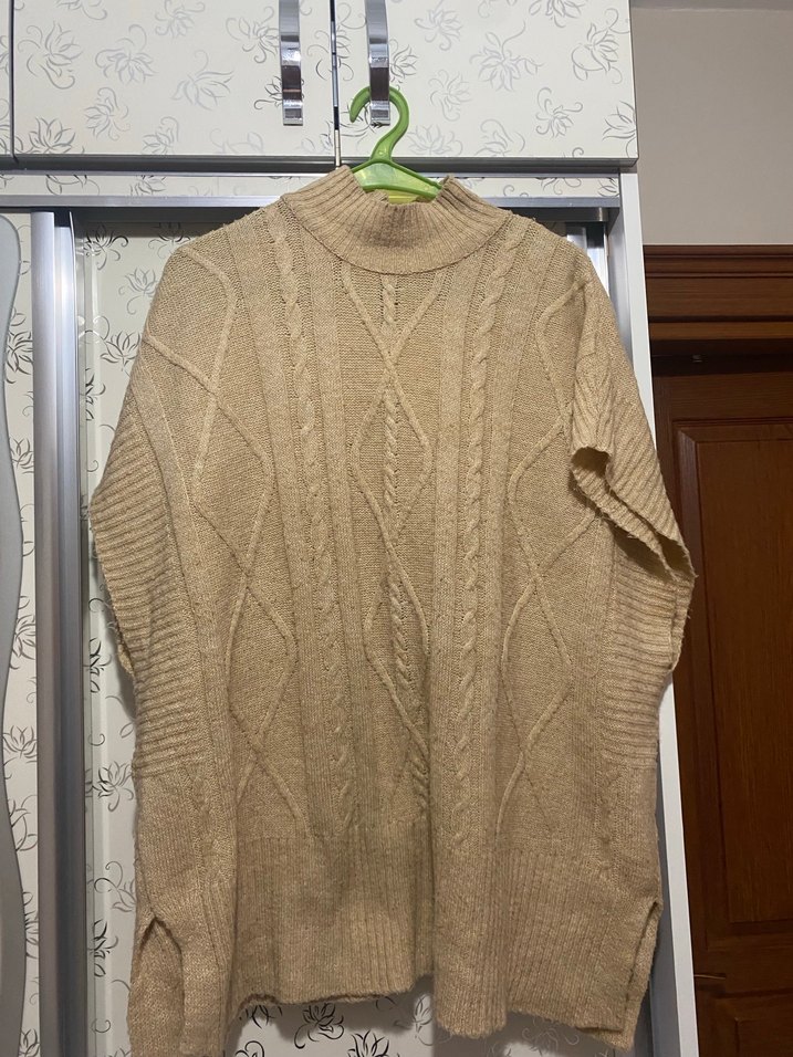 Bej renkli, boğazlı ve uzun kollu örgü kadın kazak. Salaş kesimi ve bohem tarzıyla rahat günlük kullanım için uygundur. Midi boy ve sıcak tutar. Tüycüklenme dışında sorun yoktur.