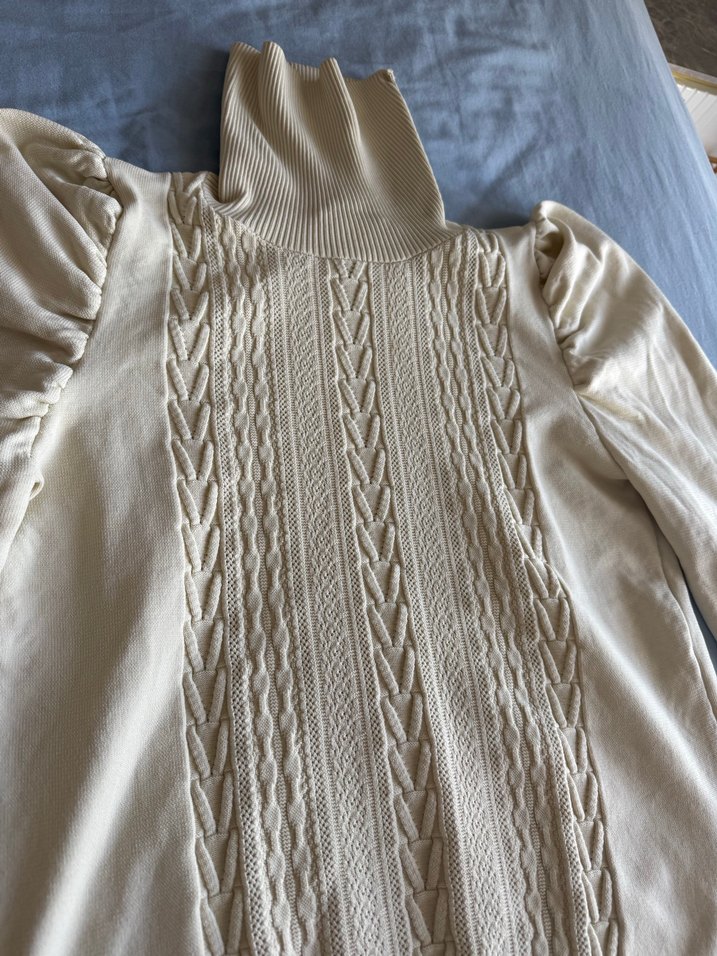 Bej renkli, boğazlı ve uzun kollu bu örgü kazak, bohem tarzda ve vücuda oturan kesime sahiptir. Düz ve pastel tonlarda, günlük kullanıma uygundur. Yepyeni sayılı giyildi balon kol detaylı
