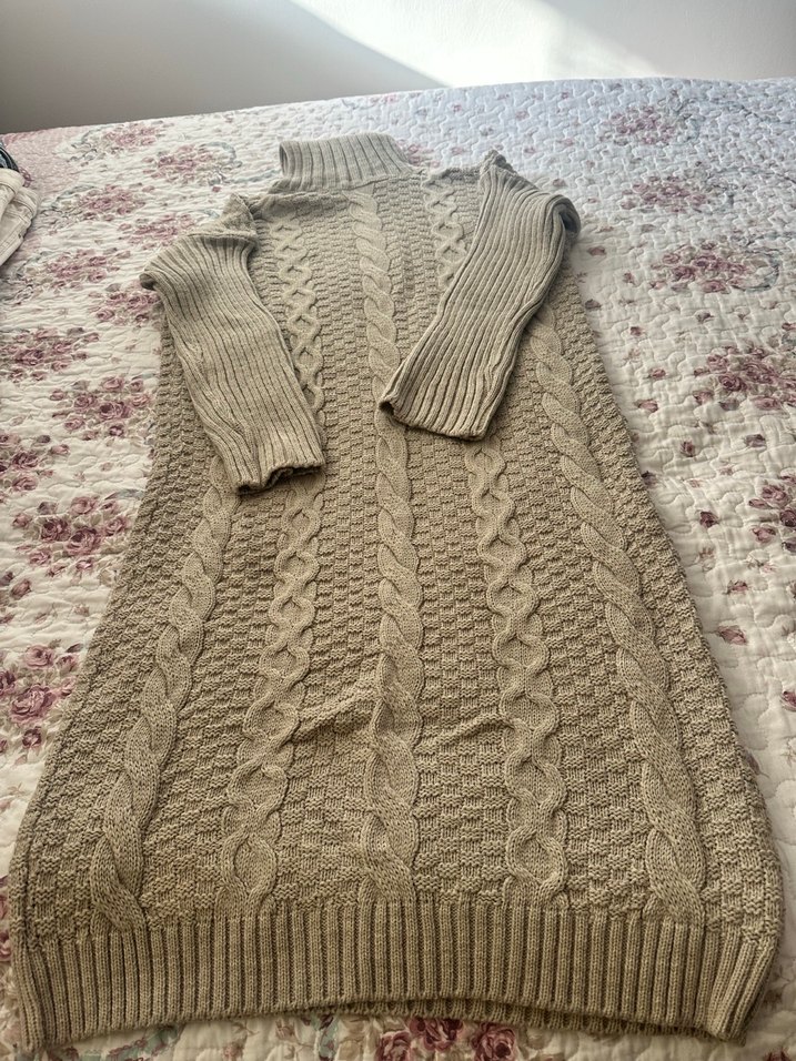 1 kere kullandım sıfırdan farksız boyu bana kısa geliyor 115 cm boyu Bej renkli, bohem tarzda, boğazlı ve uzun kollu, uzun kesim triko kazak. İnce örme deseniyle günlük kullanıma uygun ve rahat bir modeldir.