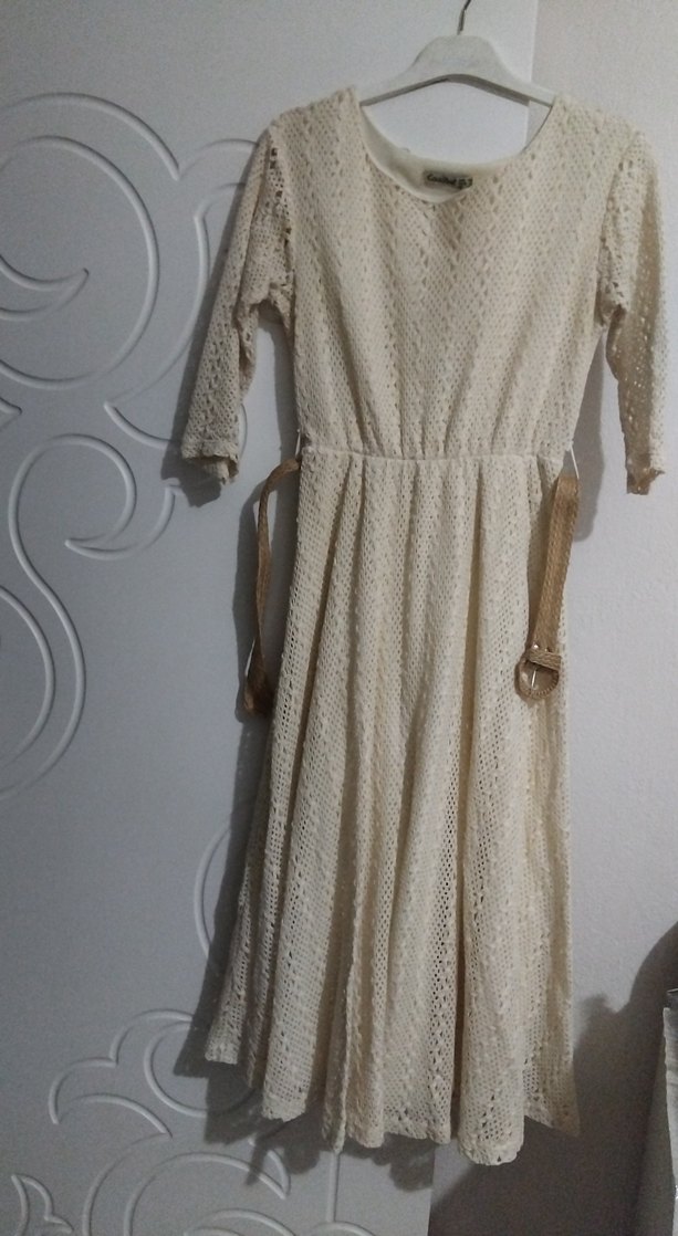 Bej renkte, dantel detaylı uzun örgü elbise. Yuvarlak yaka ve askılı kollarıyla bol kesim, vintage bohem tarzını yansıtır.