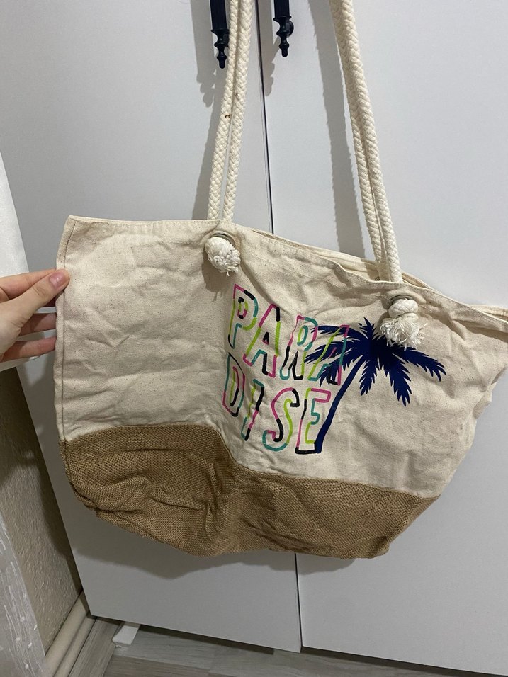 Sentetik kumaştan yapılmış, fermuarlı kapama ve ip askılı bej bohem desenli plaj çantası. Plaj için uygun.
