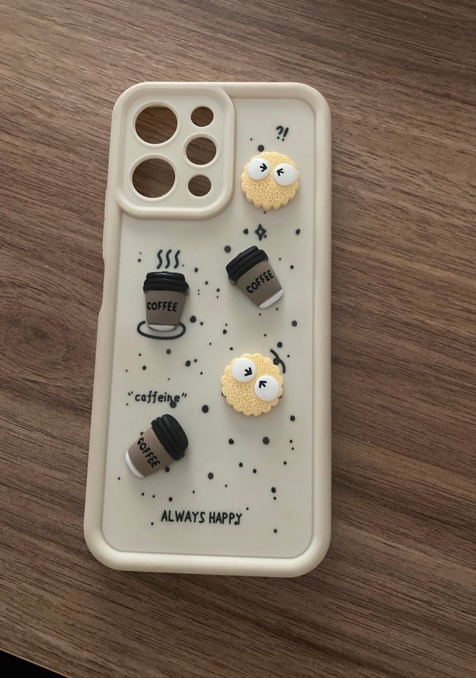 Bej renkli, bohem tarzda düğmeli telefon kılıfı. Üzerinde kahve fincanları ve sevimli desenler bulunur, "ALWAYS HAPPY" ve "caffeine" yazılıdır. ☕