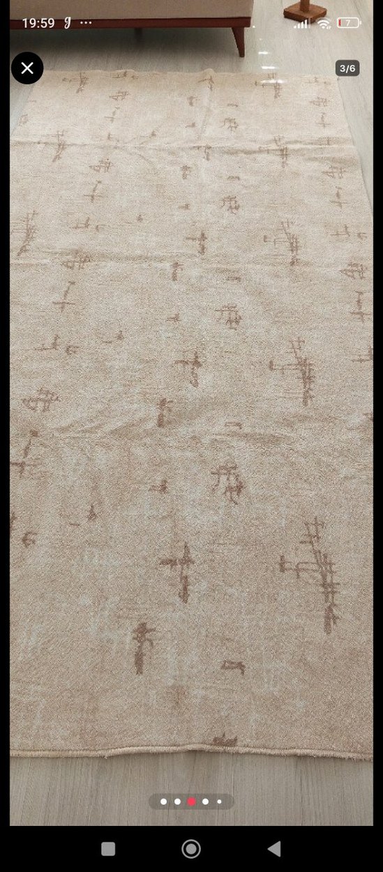 Bej renkli, bohem tarzda, yumuşak dokulu ve hafif gri detaylara sahip halı, mekana doğal bir görünüm kazandırır.