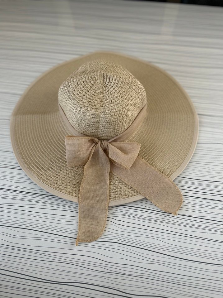 Sentetik kumaştan yapılmış, dekoratif fiyonk detaylı açık bej geniş kenarlı şapka. Bohem ve retro tarzlar için uygundur.
