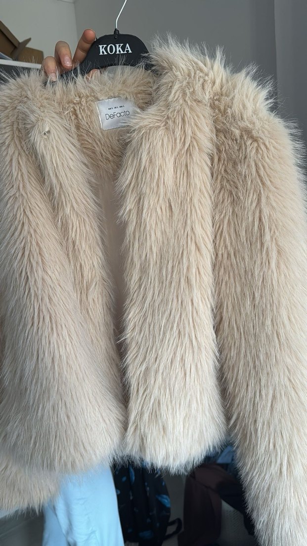 Bej renkte, uzun kollu ve yakalı, suni kürk detaylı bohem tarzda kadın ceketi. Yumuşak sentetik kumaştan, günlük kullanıma uygun rahat kesim.