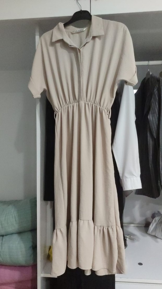 Bej renkte, kısa kollu ve yakalı, dökümlü tasarıma sahip, sentetik kumaştan yapılmış bol kesim uzun elbise. Günlük kullanıma uygun minimal bohem stil.