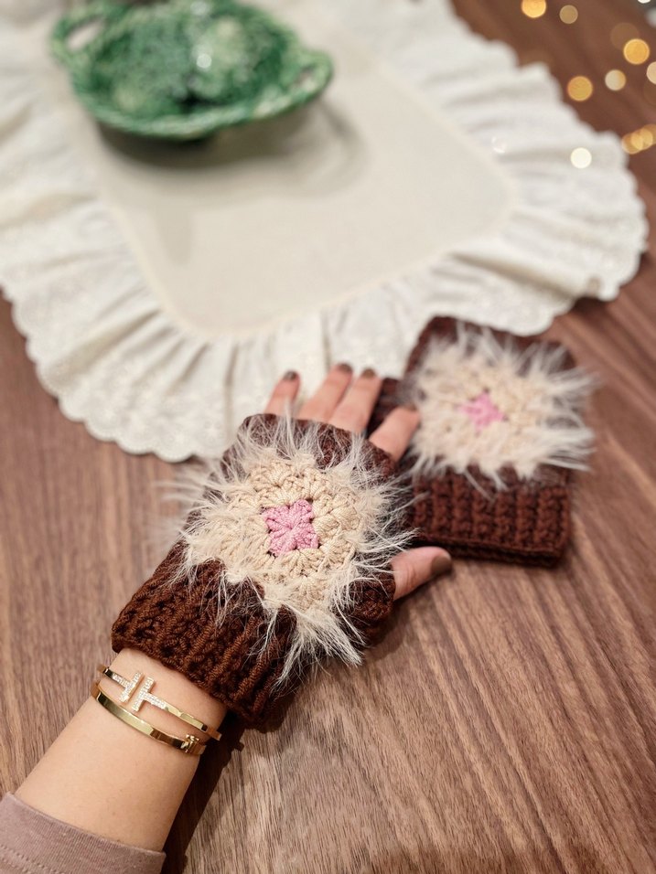 Bej renkte, kürklü detaylı örgü kadın eldivenleri. Bohem ve retro tarzıyla rahat ve sıcak tutar, parmakları açık tasarımıyla konfor sağlar.
