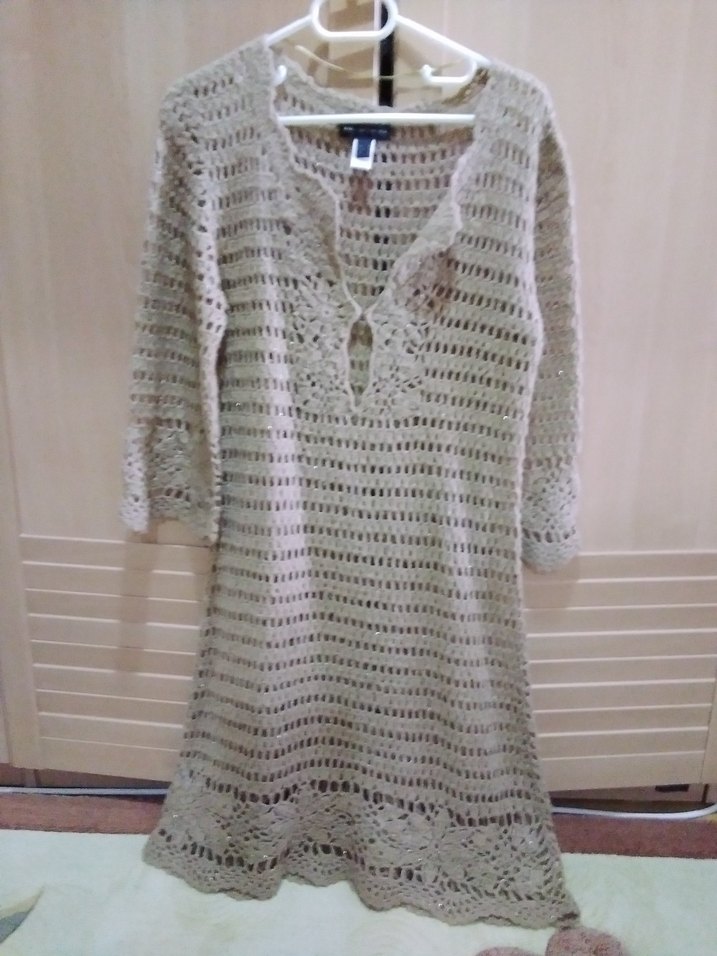 Uzun kollu, V yakalı, bol kesim bej midi örgü elbise. Günlük kullanım için bohem tarzda.
