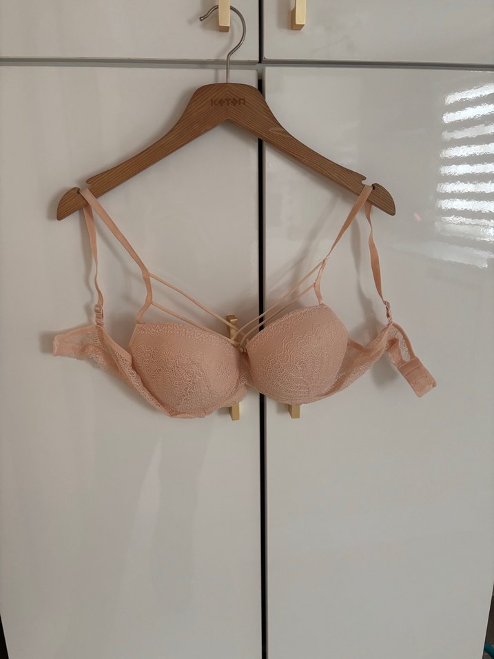 Bej bohem tarzda, yumuşak pastel tonlarda, desen içermeyen sütyen. Ayarlanabilir askılar rahat kullanım sağlar. Hiç kullanmadım markası pudra 95 beden