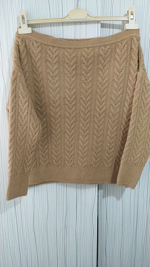 Bej renkli, örme dokulu, kayık yaka ve uzun kollu kadın kazak. Bohem tarzda, bol kesim ve kısa boyda, rahat bir görünüm sunar.